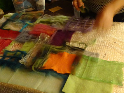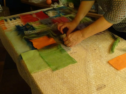 Die Wolle auszulegen ist wie ein Bild malen. Die Farben und Stoffe fließen ineinander. Nach dem Bearbeiten mit Wasser und Seife, nach reiben und walken halte ich ein Schultertuch in der Hand, dass mich immer wieder selbst überrascht.